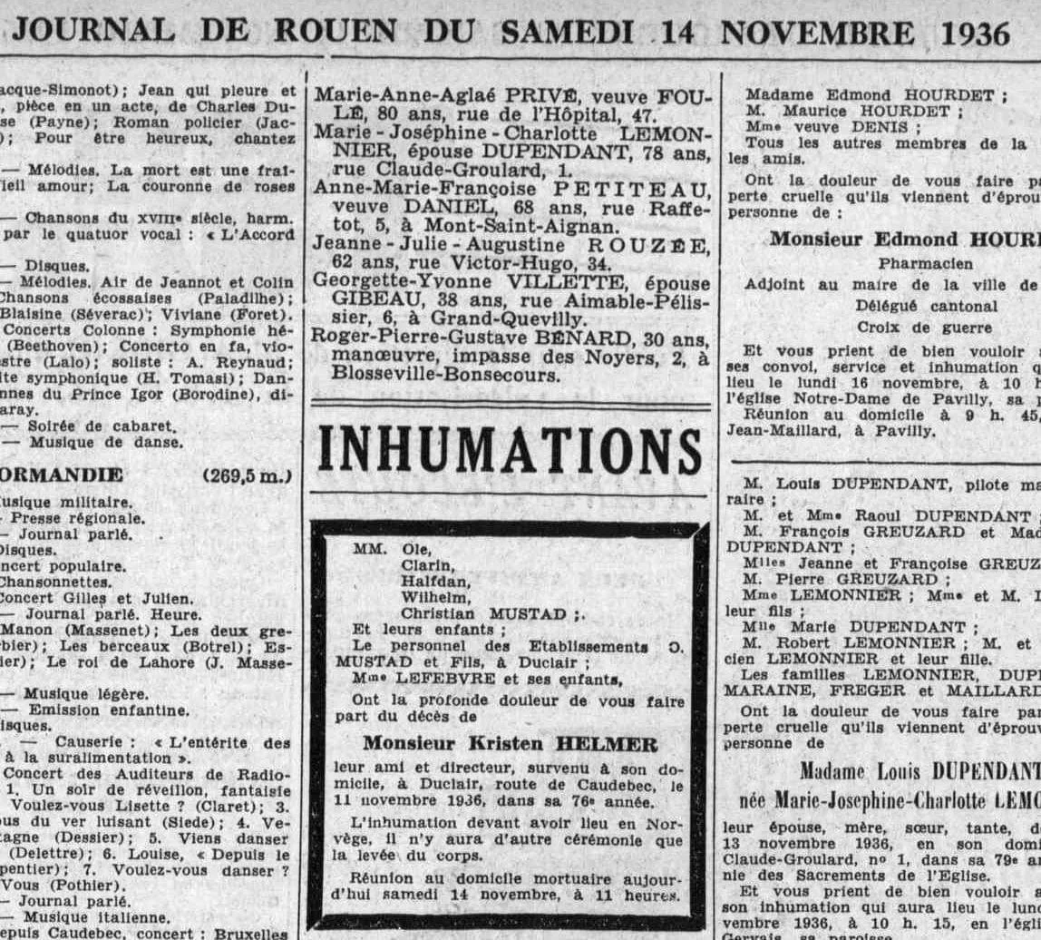 1936 skal bli et mørkt år for Clarin Mustad og driften i Duclair. Først død Mustad’s kone, før Helmer selv dør. Den 11. november 1936 dør Helmer av organ-/leversyke i Duclair, som ugift, 76 år gammel, i Duclair.