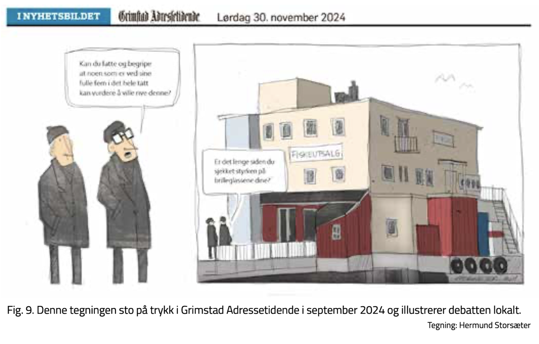 Når kommunestyret i Grimstad skal fatte sin beslutning om reguleringsplanen for Torskeholmen høsten 2025, handler det om mer enn lokal arealforvaltning. Det handler om hvilket forhold en norsk kystkommune har til sin egen historie, og om hvordan kortsiktig gevinst veies opp mot langsiktige verdier. Kommunen har i sin dialog med Riksantikvaren, så langt, valgt å ikke følge svært tydelige anbefalinger om å la bygget stå. Begrunnelsen er at det står i veien for en planlagt parkeringskjeller og at man, ved å rive det, vil få en mer helhetlig bebyggelse.7)