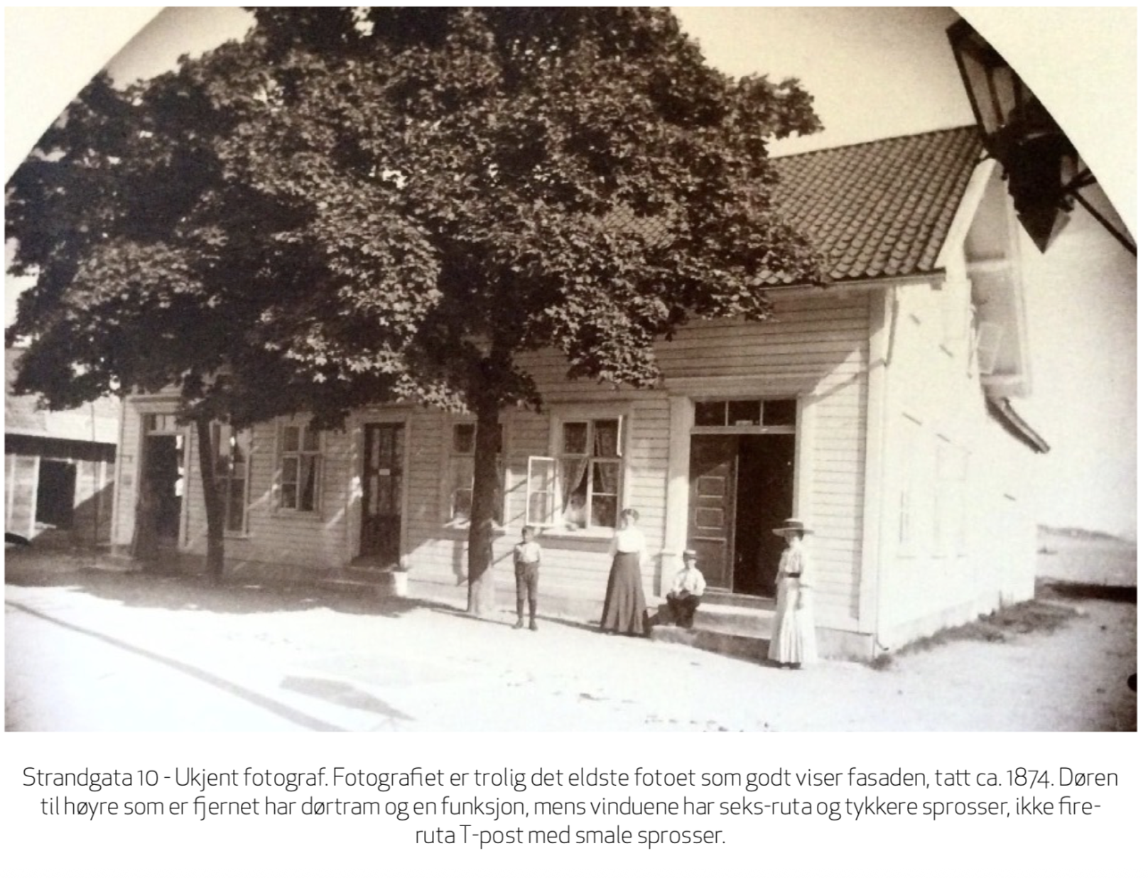 Det eldste fotoet som vi har funnet av dagens bygg/fasade i Storgata 10 er fra ca. 1874 og må sies å være det opprinnelige utseendet: