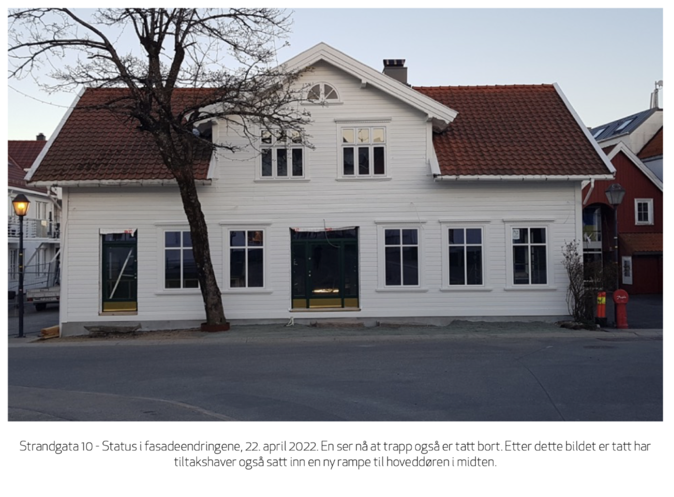 4. april 2025: Tiltakshaver søker på ny om dispensasjon. Det søkes om dispensasjon for fasadeendring av første etasje mot Strandgata 10. Fasaden er endret uten godkjenning. Endringer som er utført er blant annet endring av vinduer, samt fjerning av dør som har vært vurdert som viktig i vernesammenheng. Det søkes nå om at dør som ble fjernet settes tilbake, men at øvrige deler av fasaden opprettholdes som utført ulovlig.