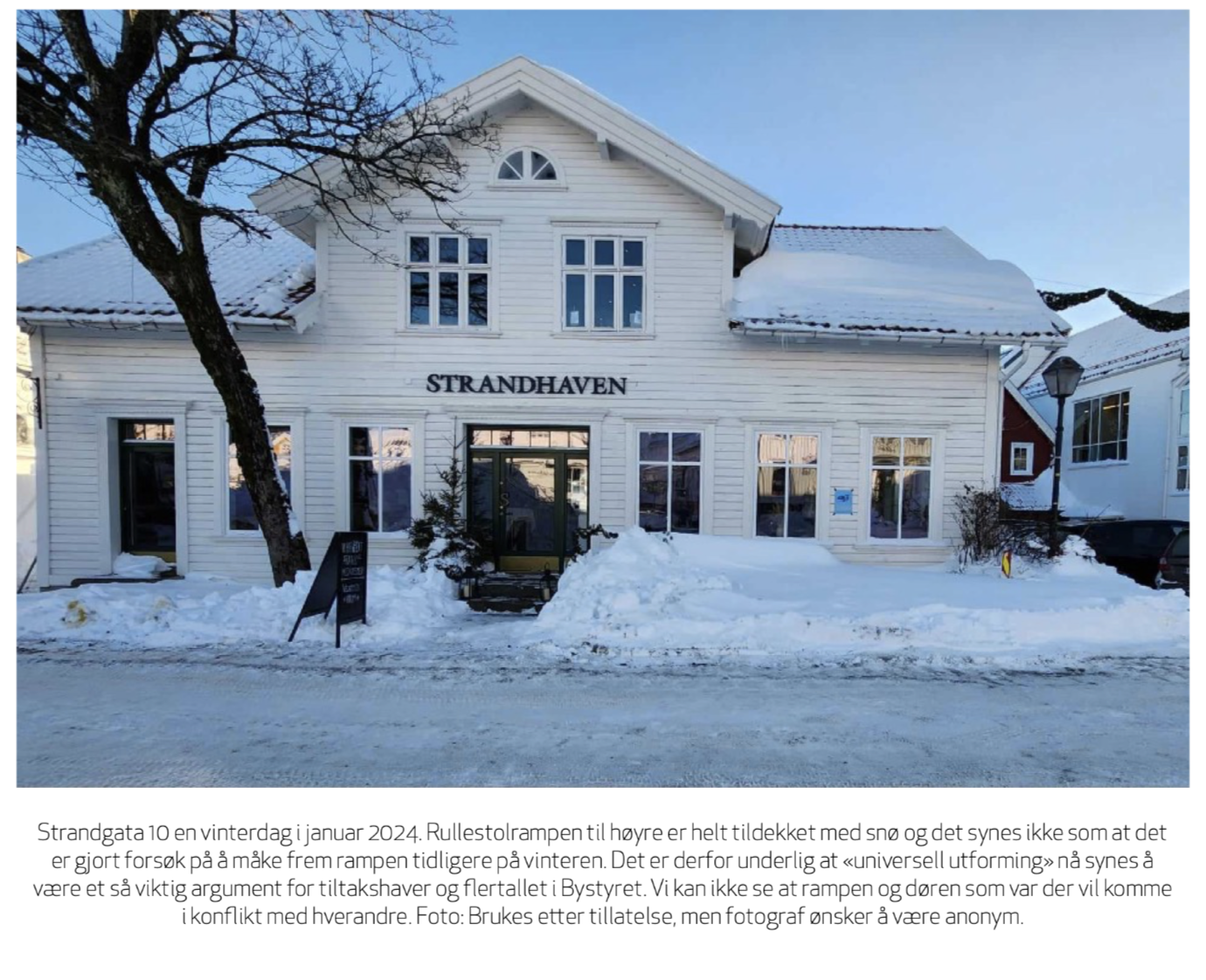 18. februar 2024: Da universell utforming fikk så stort fokus i Bystyrets behandling, kontaktet vi Agder fylkeskommune. De skriver i et svar til Fortidsminneforeningen blant annet følgende: "Tiltakshaver har ikke lever noen undersøkelse om det er mulig å beholde trapp og ha rampe.»