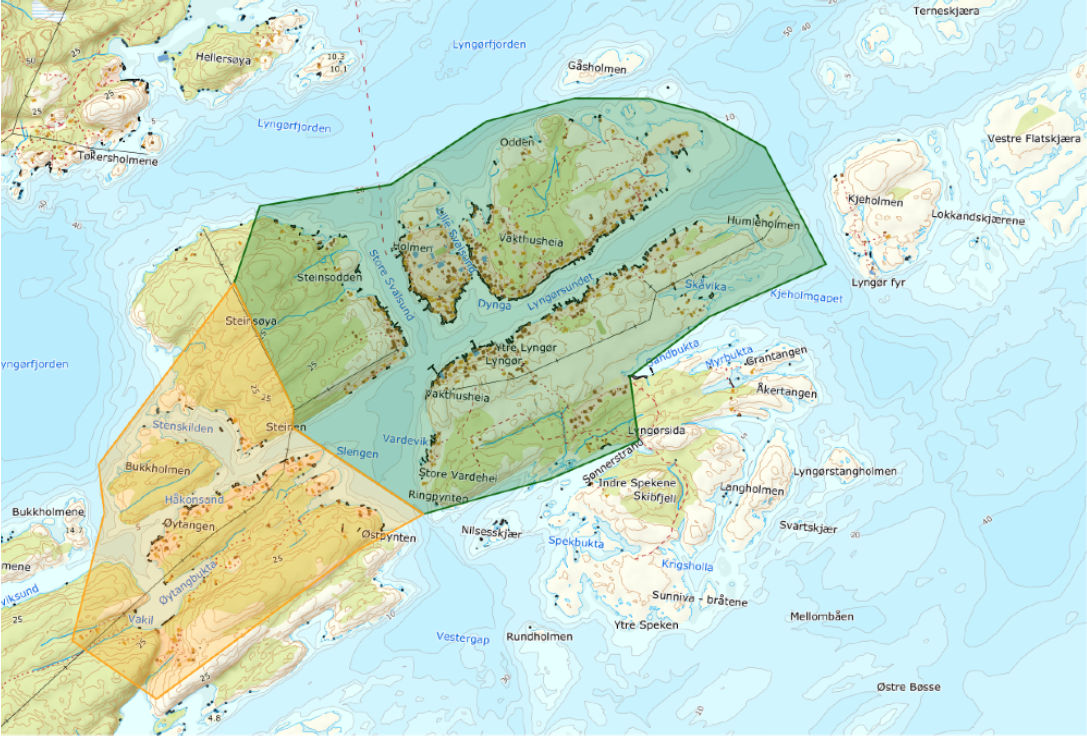 Grønt område viser eksisterende foreslått planområde. Oransj område i vest ber vi om at blir tilført. Området består av flere bevaringsverdige bygg og seilingsrutene til/fra Lyngør går også igjennom dette området og oppleves som en del av Lyngør. Det er viktig å tenke stort og se helheten.