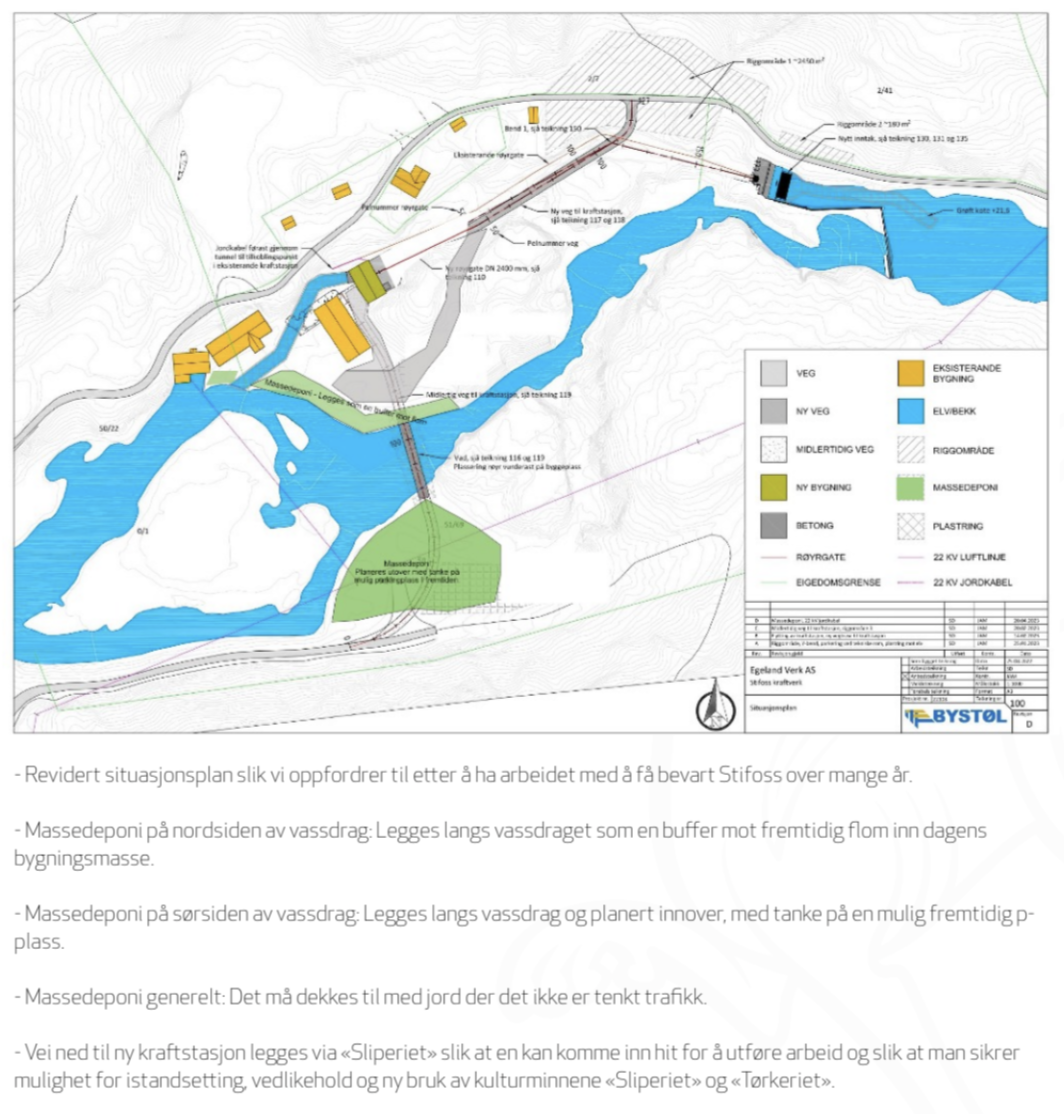 Konklusjon: Det finnes ingen tvil om verneverdiene som foreligger i og rundt Stifoss anlegget., området har hatt stor betydning for utviklingen av østre del av Agder. Industrimannen Gunnar Knudsen som senere skulle bli Norges statsminister var aktiv i utformingen av sliperibygget. Siden 2019 har det vært en økende positiv utvikling rundt bevaringstanken av bygningsmassen og kulturminnene i terrenget rundt. Dette er tydeliggjort gjennom uttalelser fra Agder fylkeskommune og klargjøring om at kulturmiljøet snarest mulig implementeres som hensynssone bevaring H570 i aktuelle kommuneplaner. Dialog, tydelighet og tillit medførte også til at vi da dispensasjonssøknadene ble behandlet ikke bad om detaljregulering av kulturmiljøet fordi det utifra de opplysninger vi fikk innhentet fra NVE og forvaltningen syntes åpenbart at en kunne sette ulike typer krav i detaljplanen. Detaljregulering syntes overflødig fordi man skulle lage en detaljplan. Først 21. november 2024 ble vi klar over at detaljplanen må forholde seg til konsesjonsvilkårene, noe som også indirekte bekreftes av NVE i deres brev av 6. desember 2024. Hadde vi vært klar over dette ville vi bedt om kommunal detaljregulering mens vi kunne. Forvaltningen må eller burde i april 2024, da dispensasjonsspørsmålet var oppe og en fortsatt kunne krevet detaljregulering, forstått at vi ikke forstod og de derfor slik vi ser det har sviktet lovens krav til opplysnings- og veiledningplikt. Vi er derfor tvunget til å måtte påklage detaljplanen slik den står, det er avgjørende at ny tilkomstvei til ny kraftstasjon legges om slik at deler av viktige kulturminner slik som tømmerrenne og gammel rørgate også kan bevares, samt at både ny kraftanlegg og gammel bygningsmasse får enklere tilkomstvei og således mulighet til å bli satt istand. Begrunnelsen for at massedeponiene ikke kan få en fornuftig bruk holder ikke mål og bes endret på. Det er også vanskelig å forstå at det ikke er fagkompetansen i fylkeskommunen og kommuneplanens bestemmelser som skal ha det siste ordet ifm utforming av ny kraftstasjon. Til slutt bes det om en ny vurdering av utsatt iverksettelse jf. Fvl. §42, minimum at det settes vilkår.