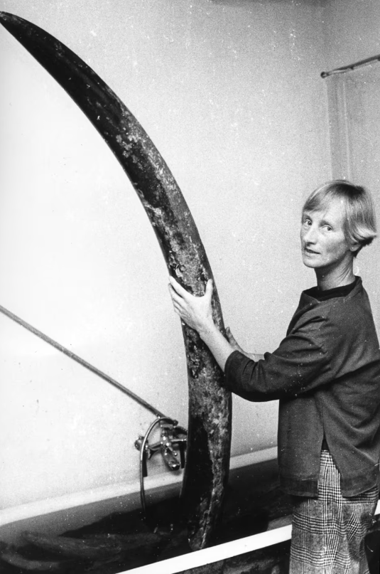Konservator Ruth Hamran ved Aust-Agder Museet med en av elefanttennene fra Fredensborg på et gammelt arkivbilde.